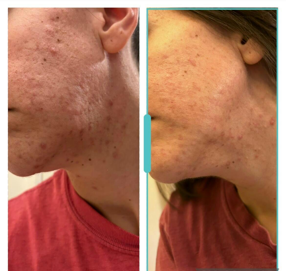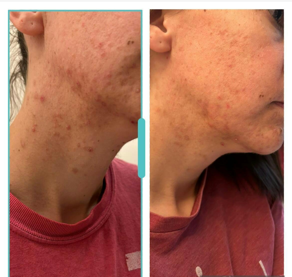 I get constant pimples from anything you can think of and since starting this I’ve definitely noticed them clearing up faster. You do have to get past the slight chlorine scent but I usually just put Esther serum or tallow on directly after and the scent doesn’t linger. I don’t have a before and after because I forgot but also my skin always has a new pimple so it looks no different to me lol. But the pimples go away faster for sure!